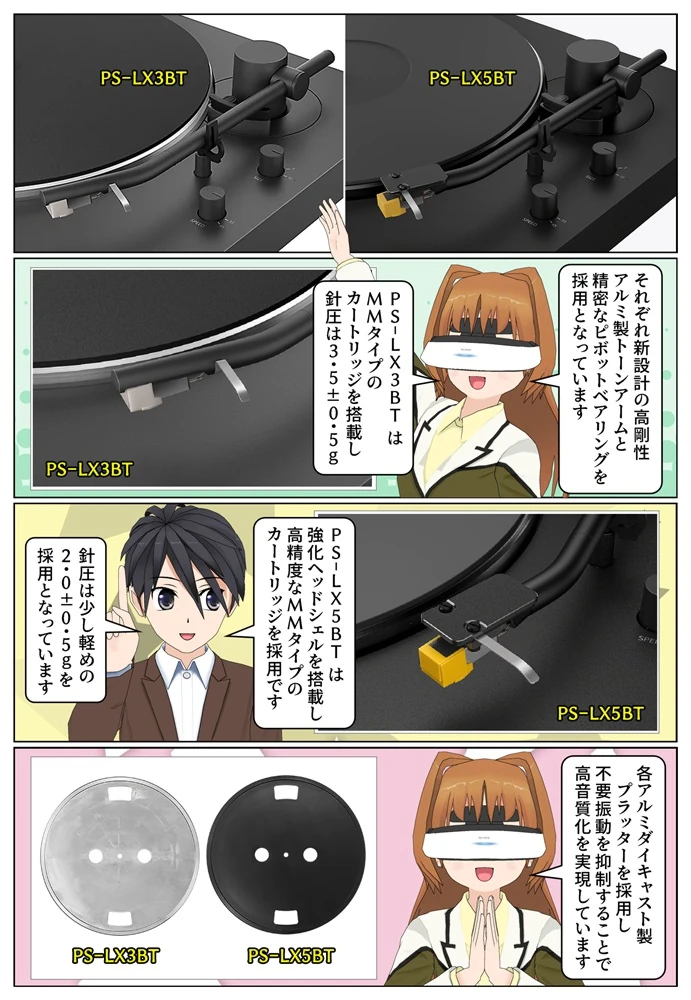 「PS-LX5BT」と「PS-LX3BT」は新設計の高剛性アルミ製トーンアームと